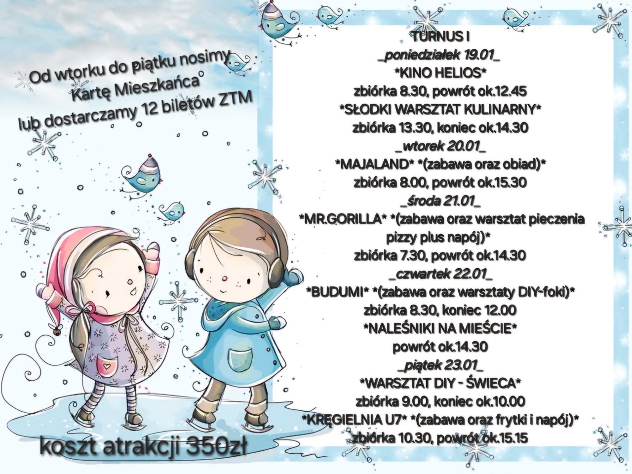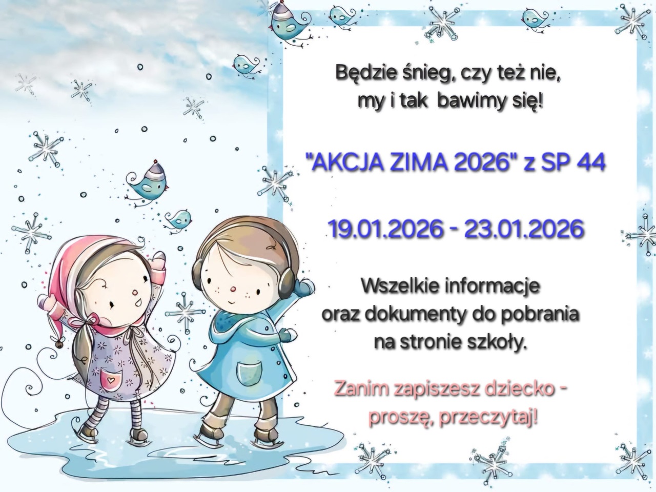 Zapraszamy do udziału w półkoloniach odbywających się na terenie SP44 "Akcja Zima 2026 r." Opiekunów prosimy o dokładne zapoznanie się z regulaminem oraz wszelkimi informacjami.